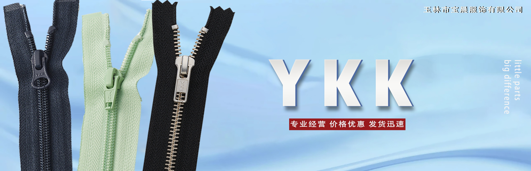 玉林市寶晨服飾有限公司是YKK吉田拉鏈(深圳)有限公司正式簽約經銷商。本公司主營業務是以拉鏈批發為主。我司致力于經營YKK出品的各種拉鏈。主營:YKK金屬牙拉鏈及拉頭、YKK尼龍拉鏈及拉頭、YKK RC箱包系列——尼龍碼裝拉鏈及拉頭、YKK樹脂牙拉鏈及拉頭、YKK Y牙牛仔系列拉鏈等。 本著共贏、 互利的精神,憑借十多年YKK拉鏈的銷售經驗,我司將以合理的價格為您提供全面、細致、周到的服務,解決您在拉鏈使用中各方面的難題,歡迎來電咨詢、溝通。 ……